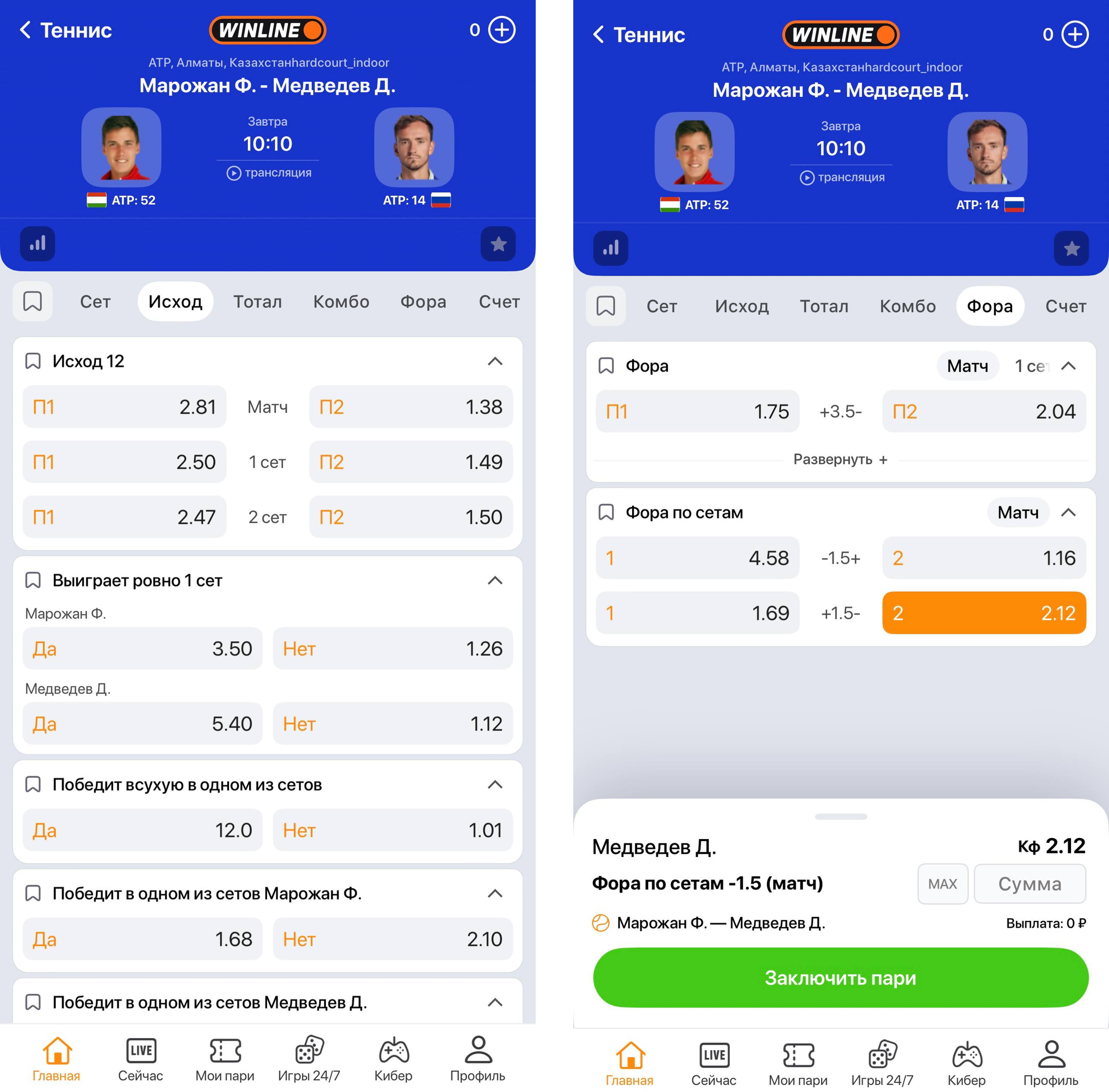 В теннисе фора 1(1,5) применяется к количеству выигранных геймов или сетов. Например, Ф1(-1,5): первый игрок должен выиграть с преимуществом в два гейма или более. Ф1 (+1,5): первый игрок не проиграет с разницей более чем в один гейм. К примеру, в матче ATP 250 в Алматы между Фабио Марожаном и Даниилом Медведевым вы поставили на Ф1 (-1,5) по сетам на Медведева. Поскольку данный турнир подразумевает трехметровый формат, то для выигрыша пари россиянину необходимо выиграть матч в двух сетах.