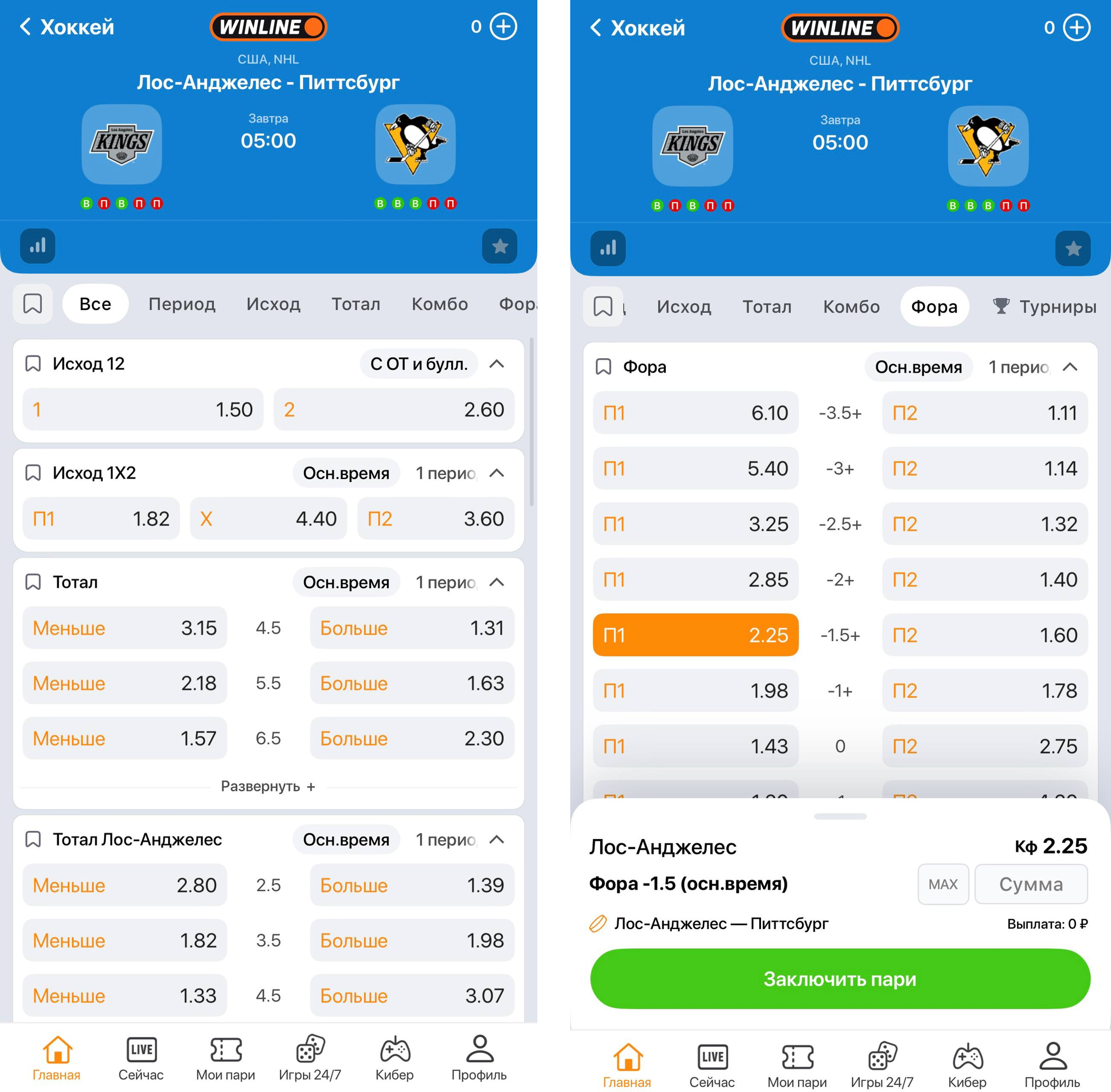 Пример. Матч НХЛ «Лос-Анджелес Кингс» — «Питтсбург Пингвинс» вы поставили на Ф1 (-1,5). Ставка выиграет, если «Кингс» победят с разницей в две или более шайбы (например, 4:1, 5:2, 2:0).