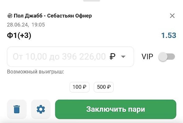 Пример №2. Представим обратную ситуацию в матче Пол Джабб — Себастьян Офнер. Вы заключили пари на фору 1 (+3) за кэф 1.53. Допустим, Джабб проиграл первый сет 0:6, а затем выиграл 2 партии — 7:6, 7:6.