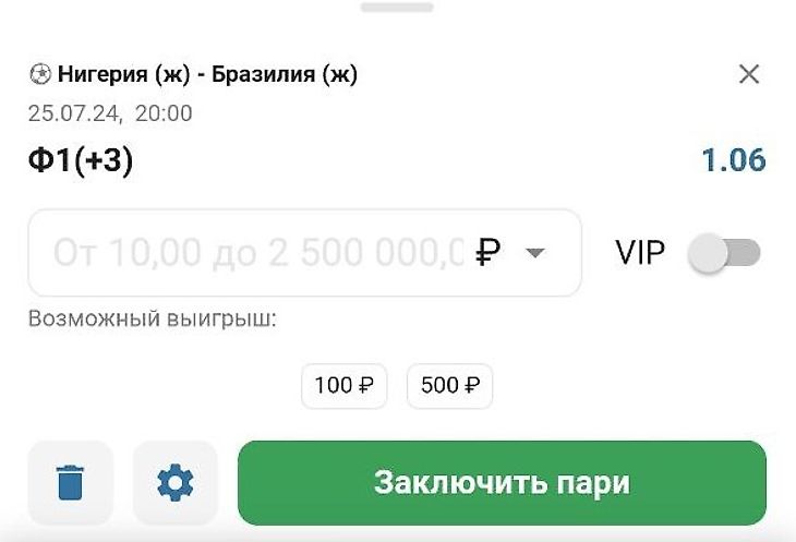 Пример №2. Матч женского Олимпийского турнира 2024 года в Париже между Нигерией и Бразилией. Команды играют на нейтральном поле, а Нигерия указана первой просто в порядке очереди. Явный фаворит матча — Бразилия, но шансы на разгромную победу букмекеры оценивают очень низко и предлагают на Ф1 (+3) низкий коэффициент 1.06.