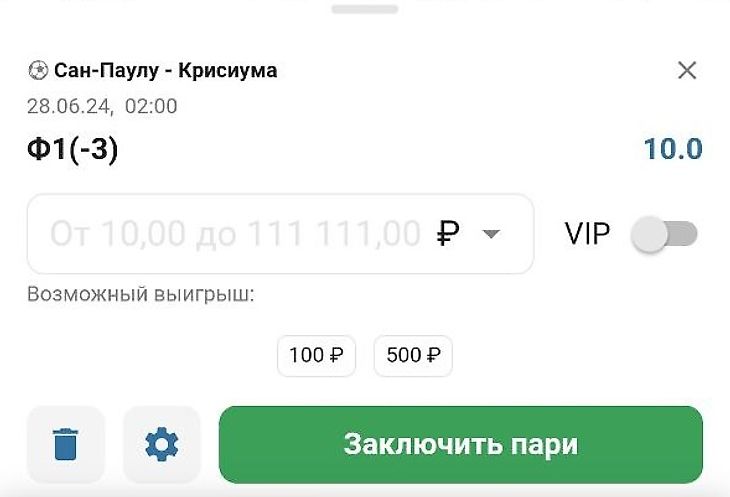 Пример №1. Матч чемпионата Бразилии «Сан-Паулу» — «Крисиума». «Сан-Паулу» — фаворит матча (коэффициент на П1 составляет 1.55), но не настолько явный, чтобы громить соперника. Поэтому ставка Ф1 (-3) предлагается за огромный коэффициент 10.00. Варианты расчета купона: