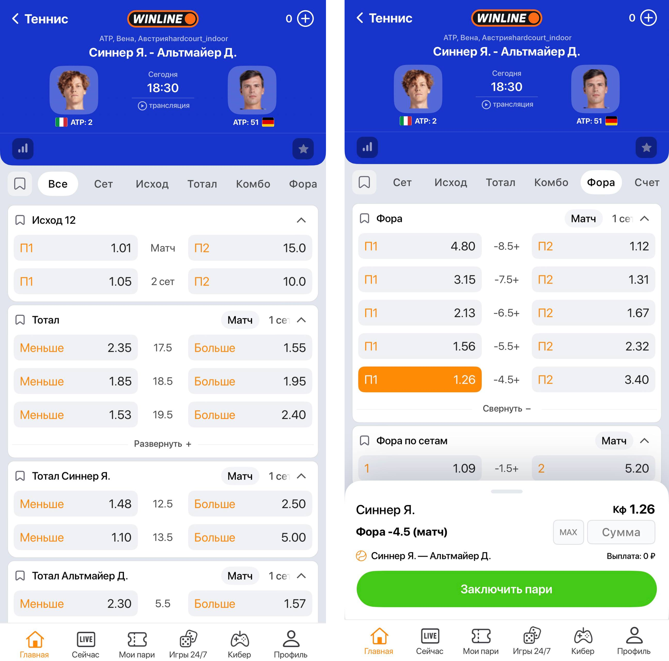 Предположим, матч завершился поражением 1-го теннисиста — 6:1, 6:7, 6:2. Считаем набранные геймы — получаем 18:10 в пользу Синнера. Ставка успешно сыграла.