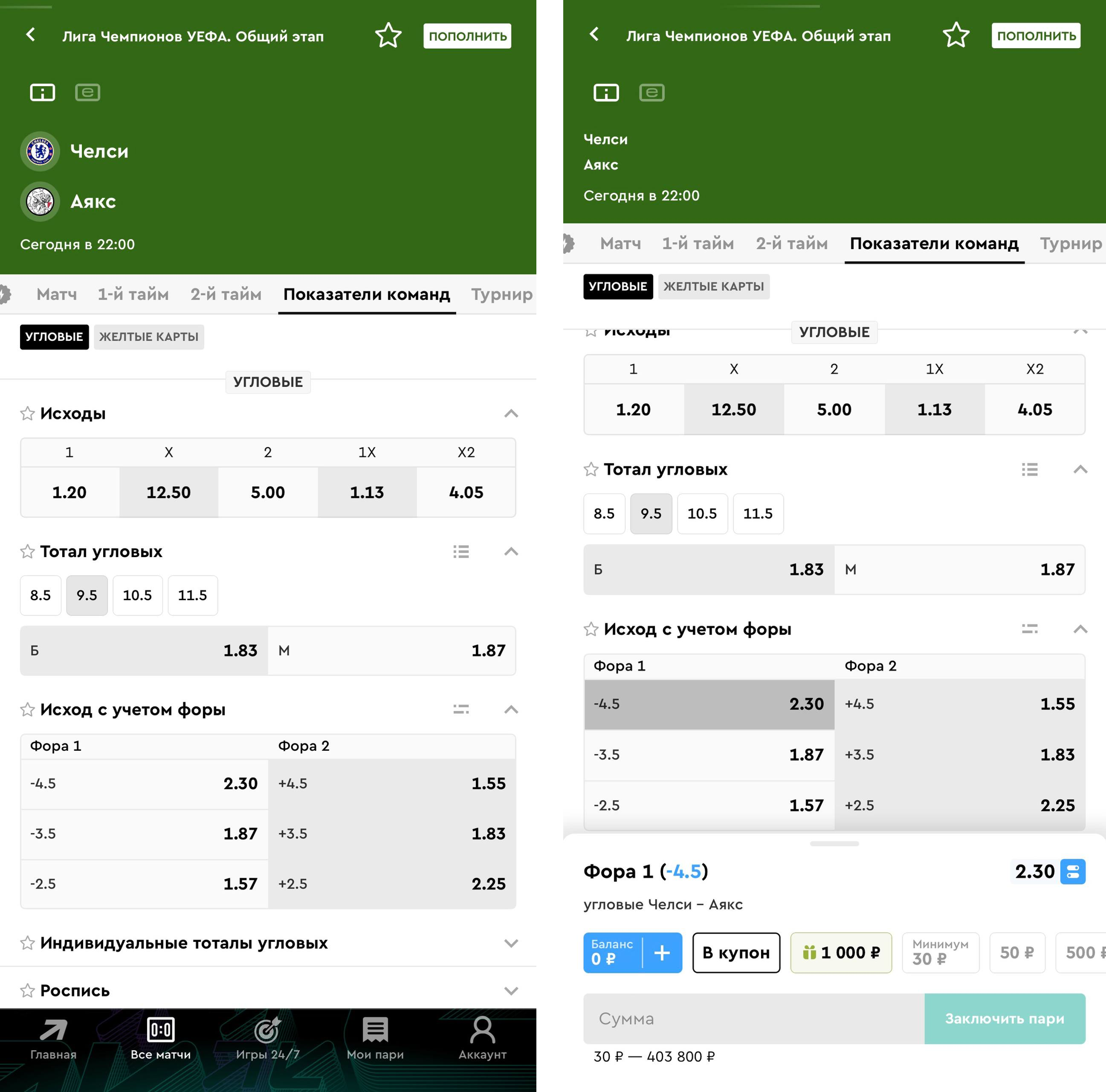 Пример №2. Матч Лиги чемпионов между командами «Челси» и «Аяксом». Фаворит матча — хозяева, и помимо основной линии, на рынках второго ранга их преимущество тоже заметно. К примеру, если вы захотите поставить на победу лондонцев по угловым, то так же можно легко найти вариант с форой, в том числе -4,5. Он оценивается на данный матч в коэффициент 2.30. Для выигрыша такого пари «Челси» должен подать на 5 или более угловых, чем «Аякс».