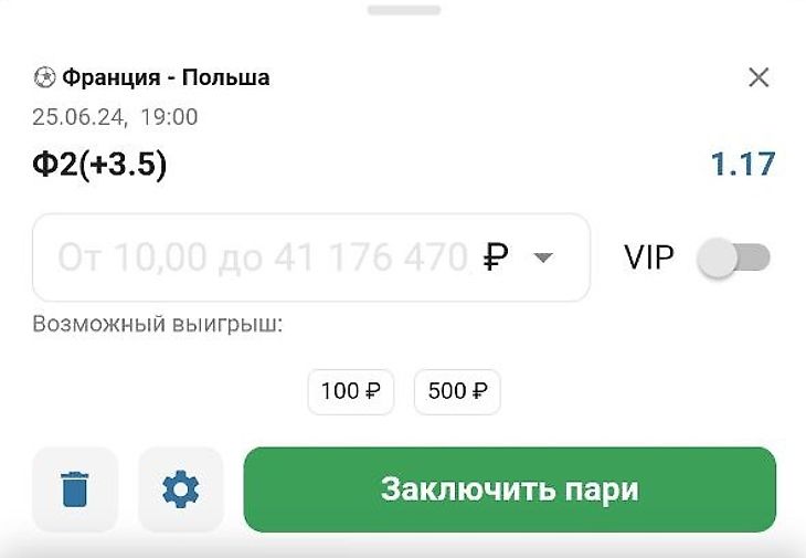 Пример №1. В матче Евро-2024 между Францией и Польшей букмекерская компания «Бетсити» предлагает ставку Ф2 (+3,5) за кэф 1.17. Франция — явный фаворит с коэффициентом 1.26 на победу, но класса Польши достаточно, чтобы на Ф2 (+3,5) букмекер выставил низкий коэффициент.