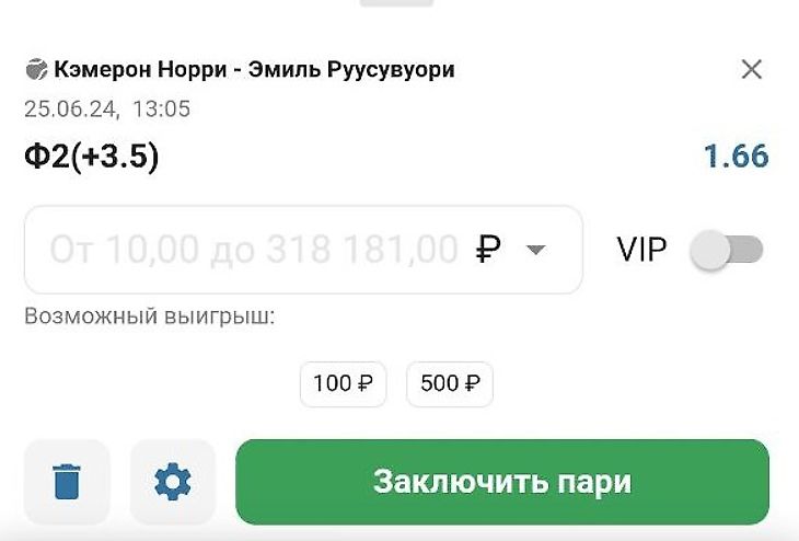 Пример №2. В матче Норри — Руусувуори беттор ставит на Ф2 (+3,5) с коэффициентом 1.66. Допустим, матч завершился успехом 2-го игрока — 7:6, 0:6, 7:6. Считаем набранные геймы — 18:14 в пользу Норри. Добавляем к результату Руусувуори значение (3.5) — получаем счет 18:17.5 в пользу того же Норри. Ставка не сыграла, несмотря на победу Руусувуори.