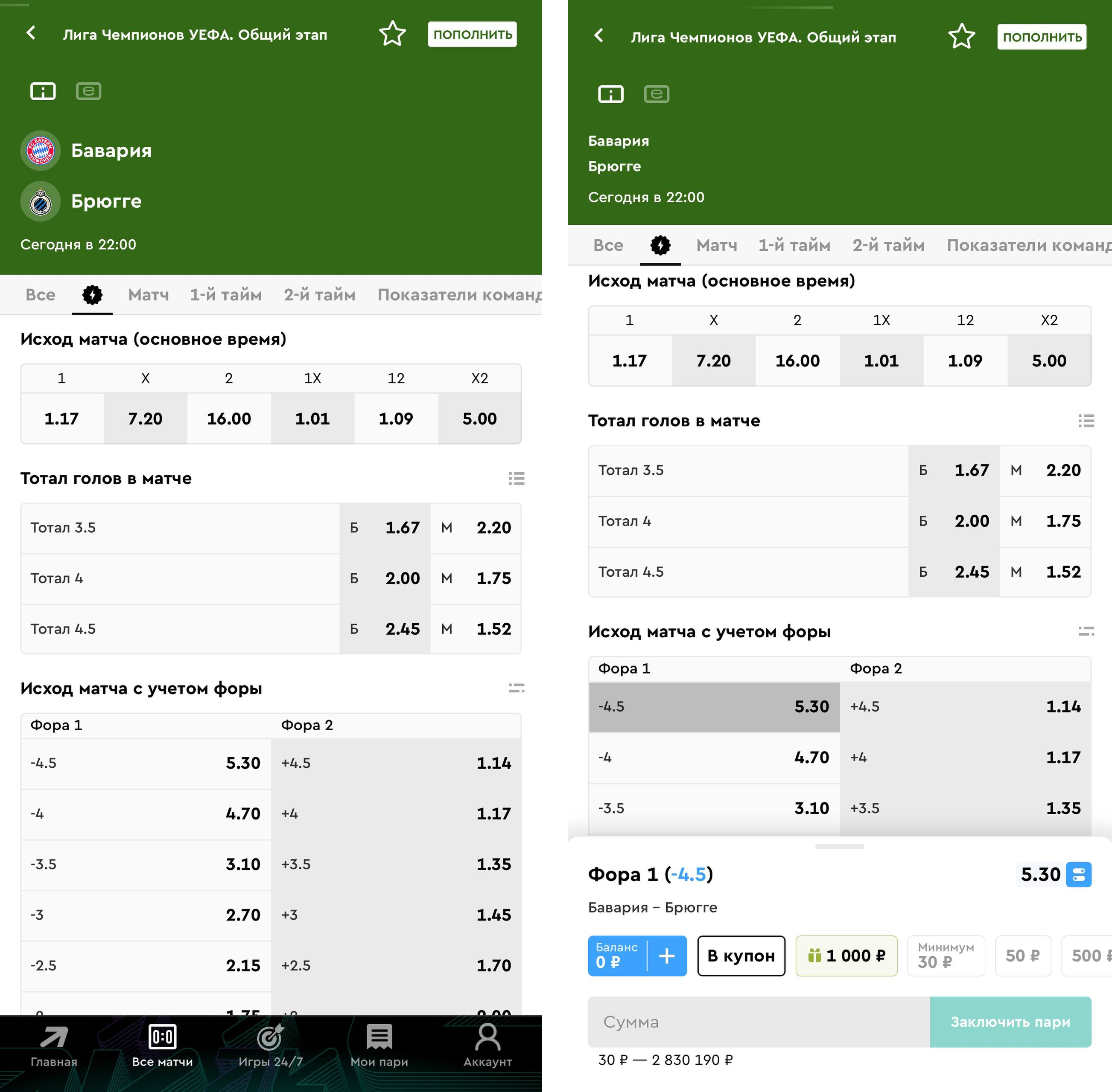 Подробнее рассмотрим примеры расчета пари на плюсовой и минусовой гандикап 4,5, взяв за основу матч Лиги чемпионов «Бавария» — «Брюгге» и ставку в 1000 рублей.