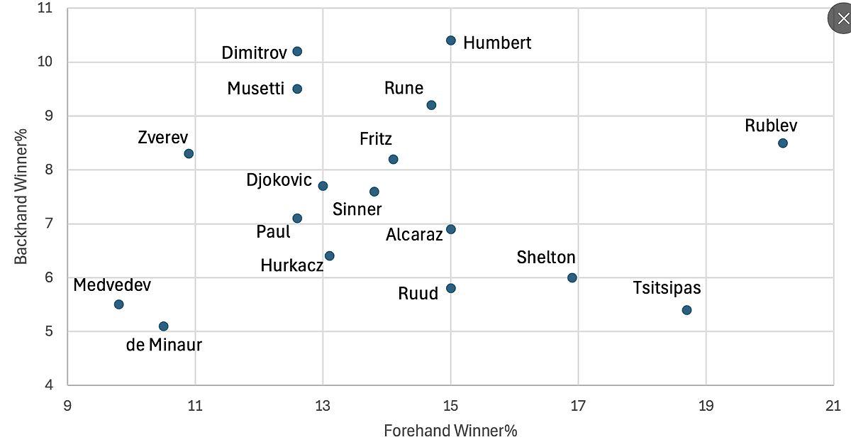 Forehand Winner% = Процент форхендов топспина (за исключением вынужденных ошибок), которые привели к победам или индуцированным вынужденным ошибкам.