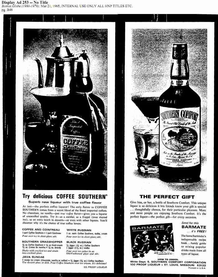 Первое известное упоминание коктейля «Белый русский» – «Черного», но со сливками – зафиксировано на рекламе новоорлеанского кофейного ликера, опубликованной в газете The Boston Globe в ноябре-1965. Кто придумал сливочный твист, неизвестно, но в подкасте The Art of Drinking предполагают, что это мог быть Донато «Герцог» Антон, легендарный миксолог послевоенной Америки. В первый список Международной ассоциации барменов, составленный в 1961-м, «Русские» не вошли, но вошли во второй в 1987-м.