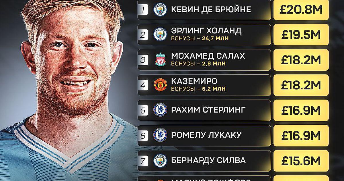 На втором месте идёт одноклубник Кевина — Эрлинг Холланд, с окладом в 19.5 млн фунтов, а также с приличными бонусами в размере 24.7 млн фунтов. Норвежец провёл по сравнению с позапрошлым не очень сезон. Безусловно, 27 голов в чемпионате привели его к «Золотой Бутсе» Англии, но то 2-ое место на «Золотой Мяч» это была фантастика.