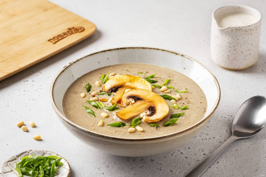 Обжарьте смесь грибов (шампиньоны, вешенки, белые грибы) с луком и чесноком, добавьте картофель и залейте овощным бульоном. Варите до готовности, затем измельчите все в блендере до однородной консистенции. Добавьте сливки, соль, перец и немного свежего тимьяна. Подавайте с гренками и несколькими каплями трюфельного масла для дополнительного аромата.