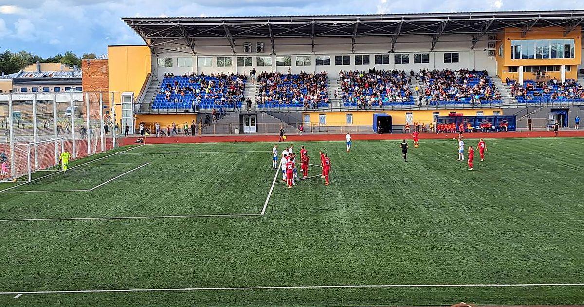 Игра проходила на стадионе «Машиностроитель». Тут пару лет назад сделали реконструкцию, и стадион стал выглядеть поприличнее. Ну потому что раньше он выглядел, конечно, так, что было понятно: футбол во Пскове умирает. Но реконструкция все же плохо сказалась на «Машиностроителе», потому что стадион потерял частичку своего обаяния, и стал похож на любой другой современный стадион в небольшом городе. В Рощино вот примерно такая же арена.