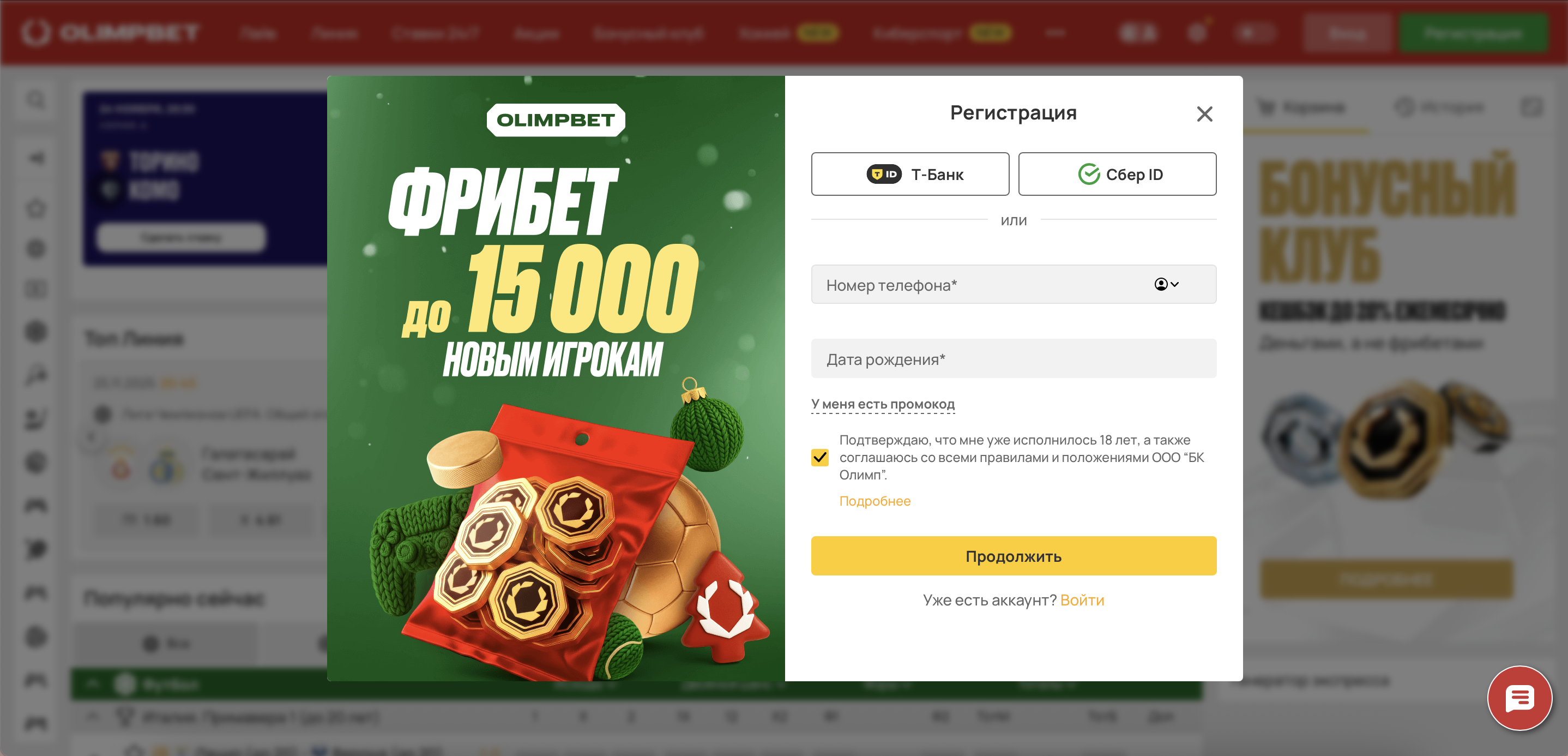 - Кнопка «Регистрация» или «Войти»: Начните с клика на кнопку «Регистрация» или «Войти» на главной странице сайта OLIMPBET. Это позволит вам перейти к процедуре входа.