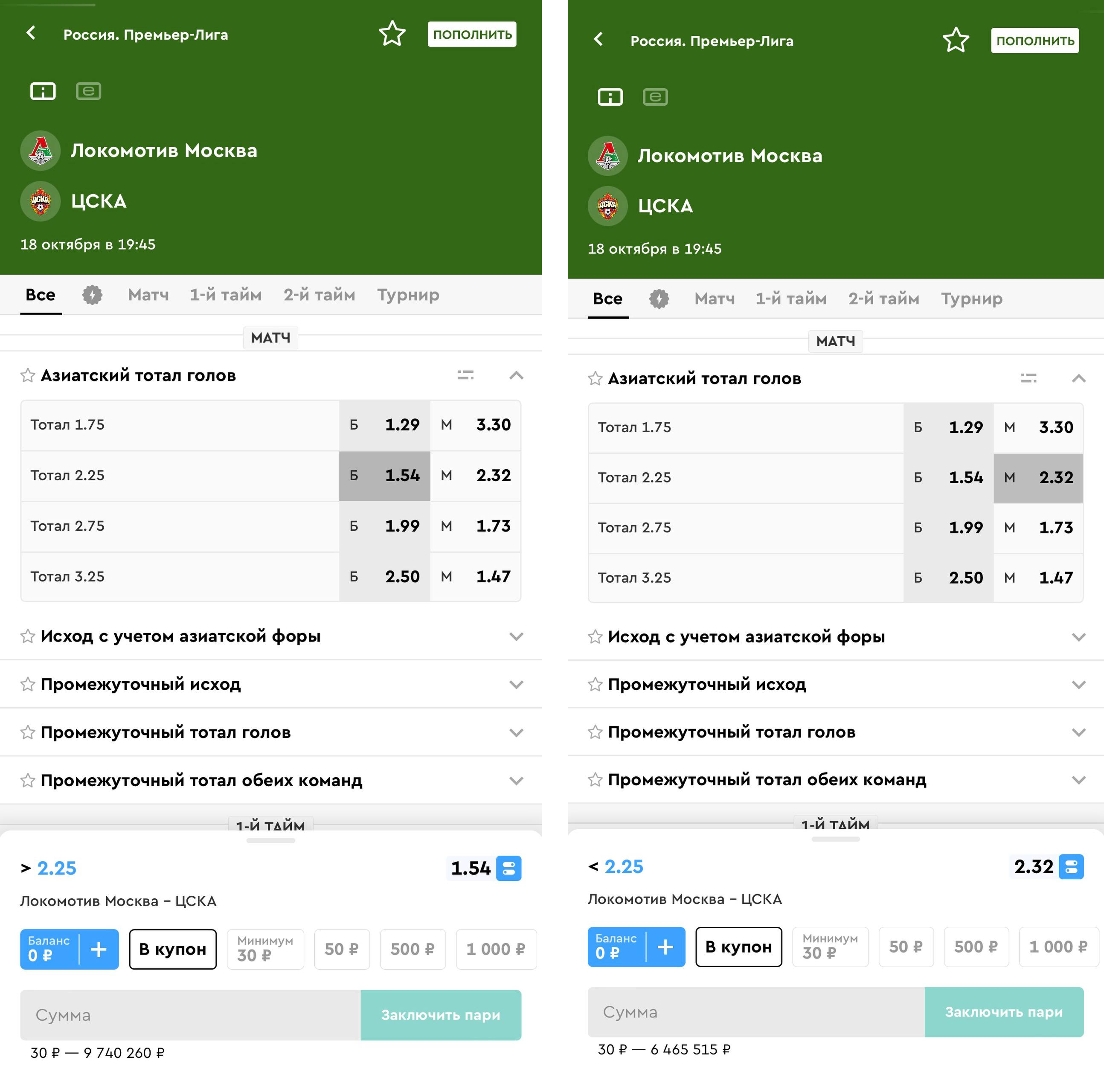 Возьмем матч «Локомотив» — ЦСКА. На ТМ 2,25 букмекер предлагает коэффициент 2.32, а на ТБ 2,25 — 1.54.