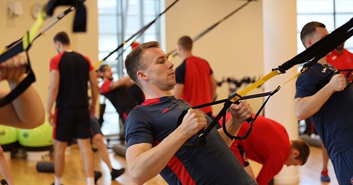 С отличным настроением ХК ЦСКА продолжает сборы в Минске Основная команда армейцев с 5 августа начала предсезонный сбор в столице Беларуси. Надо отметить, что в это время Минск и его окрестности привлекли на сборы семь клубов КХЛ, включая минское «Динамо». С этим клубом красно-синие проведут контрольный матч в заключительный день сборов 19 августа (начало в 12:00 мск). Команда под началом Ильи Воробьева проводит двухразовые занятия. Если в понедельник занятие на футбольном стадионе прошло вечером, то во вторник тренеры провели ротацию, и утром команда занималась в тренажерном зале, а вот второй половине дня отправилась на лед «Олимпик арены», где базируется во время сборов. Дорога от отеля до арены занимает не более 10 минут, так что все условия для игроков и команды созданы на отлично. Армейцы наигрывают сочетания в звеньях, и скоро мы увидим первые прикидки команды Ильи Воробьева. Вашему вниманию - фоторепортаж с утренней тренировки ХК ЦСКА.