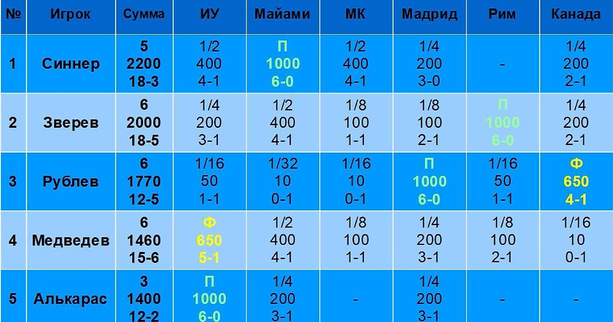 Также замечу, что пока топы не особо то хорошо играют на Мастерсах. У Медведева в 2023, после 6 Мастерсов, было 3150 очков по современной системе начисления баллов. А сейчас у лидера Синнера только 2200.