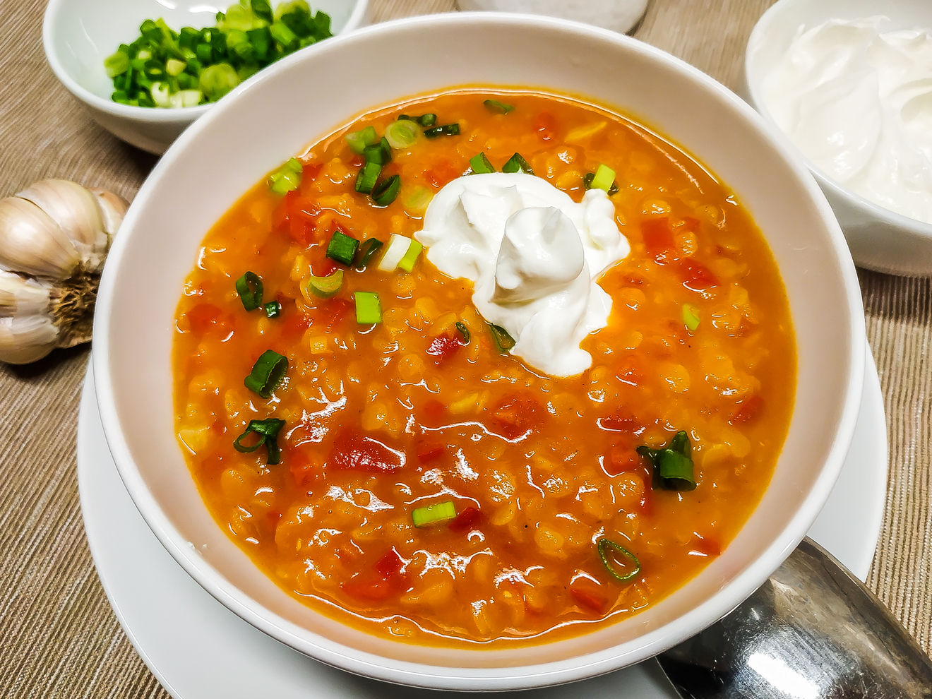 Процесс приготовления: измельчите овощи, обжарьте лук до прозрачности, добавьте чеснок, имбирь, специи. Всыпьте чечевицу, залейте водой, варите 20 минут. Влейте кокосовое молоко, доведите до кипения. Подавайте с зеленью.