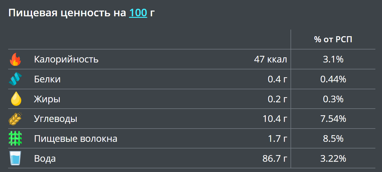 - Продукт обладает низким гликемическим индексом, что делает ее подходящим фруктом для людей с диабетом или склонностью к повышению уровня сахара в крови. Также продукт может быть полезен при анемии благодаря содержанию железа.