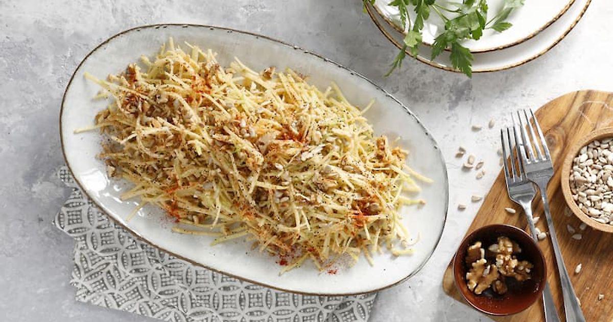 Этот салат привносит приятную сладость и лёгкость благодаря сочетанию яблок и моркови, а кунжут добавляет ореховый аромат и хруст.