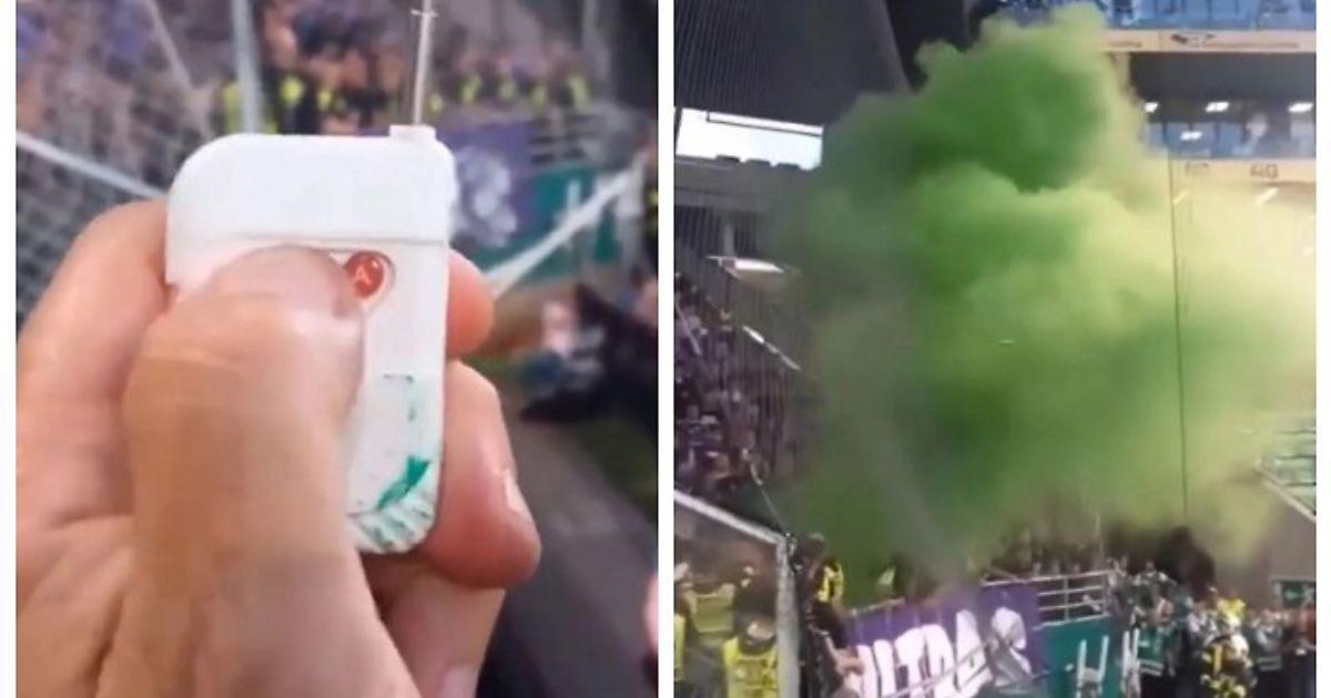 Устройство выпустило зеленый дым - цвет «Ференцвароша». Были слышны радостные крики болельщиков-хозяев поля, в то время как несколько гостей, одетых в фиолетовую форму, сердито пытались найти источник задымления.
