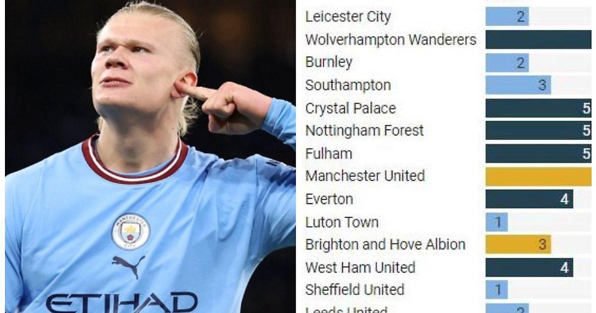 После матча с лондонской командой появилась интересная таблица, показывающая, сколько голов и с какой частотой забивает Эрлинг Холанд против 19 команд АПЛ.