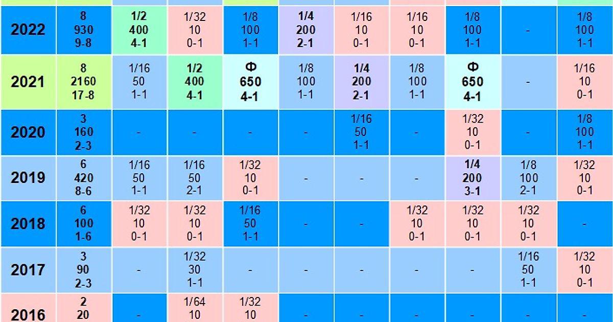 В ячейке первая строчка результат на конкретном турнире, вторая строчка - число набранных очков, в третьей соотношение побед и поражений. В столбце «Сумма» первая строчка - число турниров, сыгранных за год, вторая - сумма очков за год , третья - соотношение побед и поражений за весь год.
