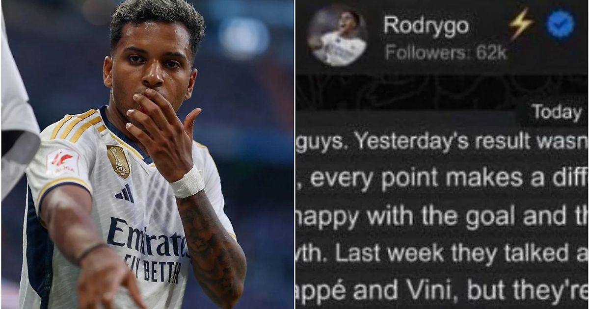 Вчера на официальном канале вингера «Мадрида» Родриго появилось, а потом исчезло сообщение. Игрок обратился к болельщикам после того, как клуб сыграл 1:1 с «Мальоркой» и потерял очки.