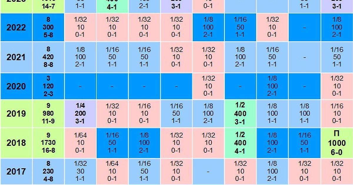 В ячейке первая строчка результат на конкретном турнире, вторая строчка - число набранных очков, в третьей соотношение побед и поражений. В столбце «Сумма» первая строчка - число турниров, сыгранных за год, вторая - сумма очков за год , третья - соотношение побед и поражений за весь год.