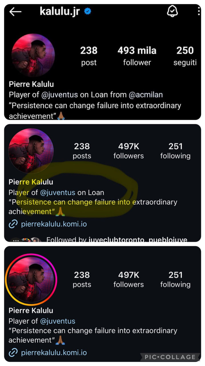 Сначала Калулу написал, что он «игрок «Ювентуса», в аренде из «Милана», потом исправил на «игрок «Ювентуса» в аренде». Финальная версия − просто «игрок «Ювентуса».