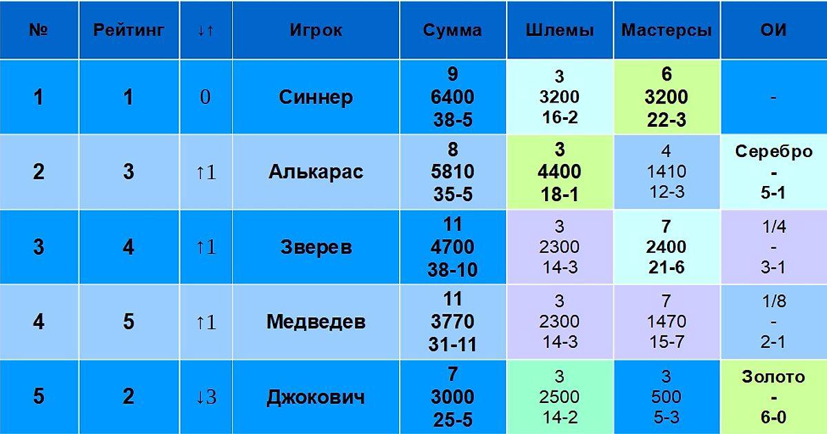 Синнер – первый, Алькарас – второй, Зверев – третий, Медведев – четвертый, Джокович – пятый.
