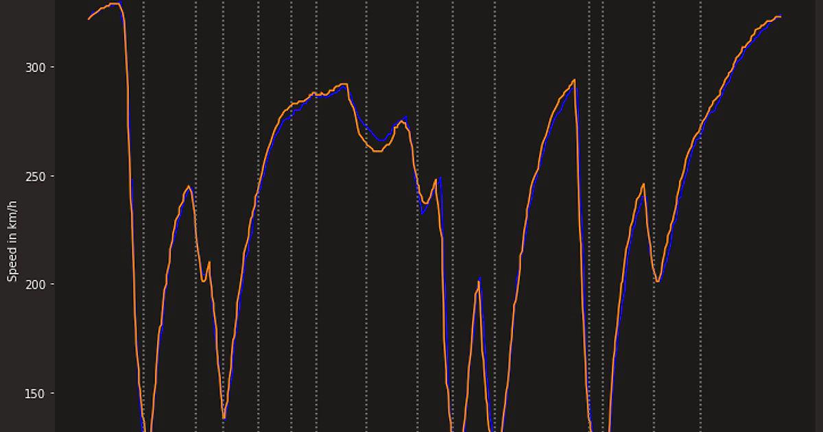 По оси у- отложена скорость каждого гонщика, по оси х - отложена дистанция трассы. Вертикальными линиями показаны номера соответствующих поворотов. Оранжевым цветом показан график скорости - Ландо Норриса, а синим соответственно Макса Ферстаненна.