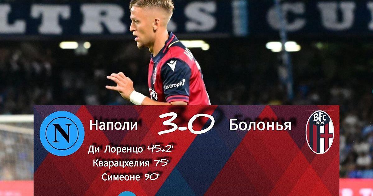Первый тайм прошел в тягучей борьбе. «Болонья» больше владела мячом, но моментов почти не было. Самый реальный появился у Кастро, которому классно, вразрез покатил Ндойе. Аргентинец не смог переиграть Мерета в ближнем бою. Под занавес тайма «Болонья» подустала и отдала мяч «Наполи». Делать этого, конечно же, не стоило, ведь в составе команды Конте есть выдающийся Хвича Кварацхелия. Именно грузинская звезда неаполитанцев придумал, как завершить симпатичную комбинацию хозяев на правом фланге, хитрой закидушкой на забежавшего в штрафную Ди Лоренцо. Второй тайм прошел без моментов вообще. Ни одним, ни другим не удавалось взорвать игру. Помогла сонливость центра поля БФК, который позволил Хвиче беспрепятственно добежать до штрафной и пальнуть по воротам. После этого гости потеряли желание сражаться и пропустили ещё. «Болонья» смотрелась куда бледнее себя самой образца первого тура - делаем безусловную скидку на уровень соперника. Команда Итальяно сегодня хорошо держала мяч, но не могла придумать с ним ничего вразумительного.