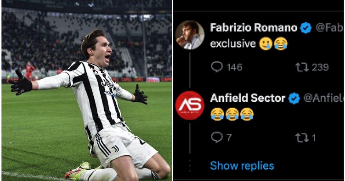 Инсайдер решил подколоть крупный портал Anfield Sector, заявивший в соцсетях, что Федерико Кьеза интересует «Ливерпуль». Дело в том, что издание назвало информацию своим эксклюзивом. А Романо писал об этом несколькими часами ранее.
