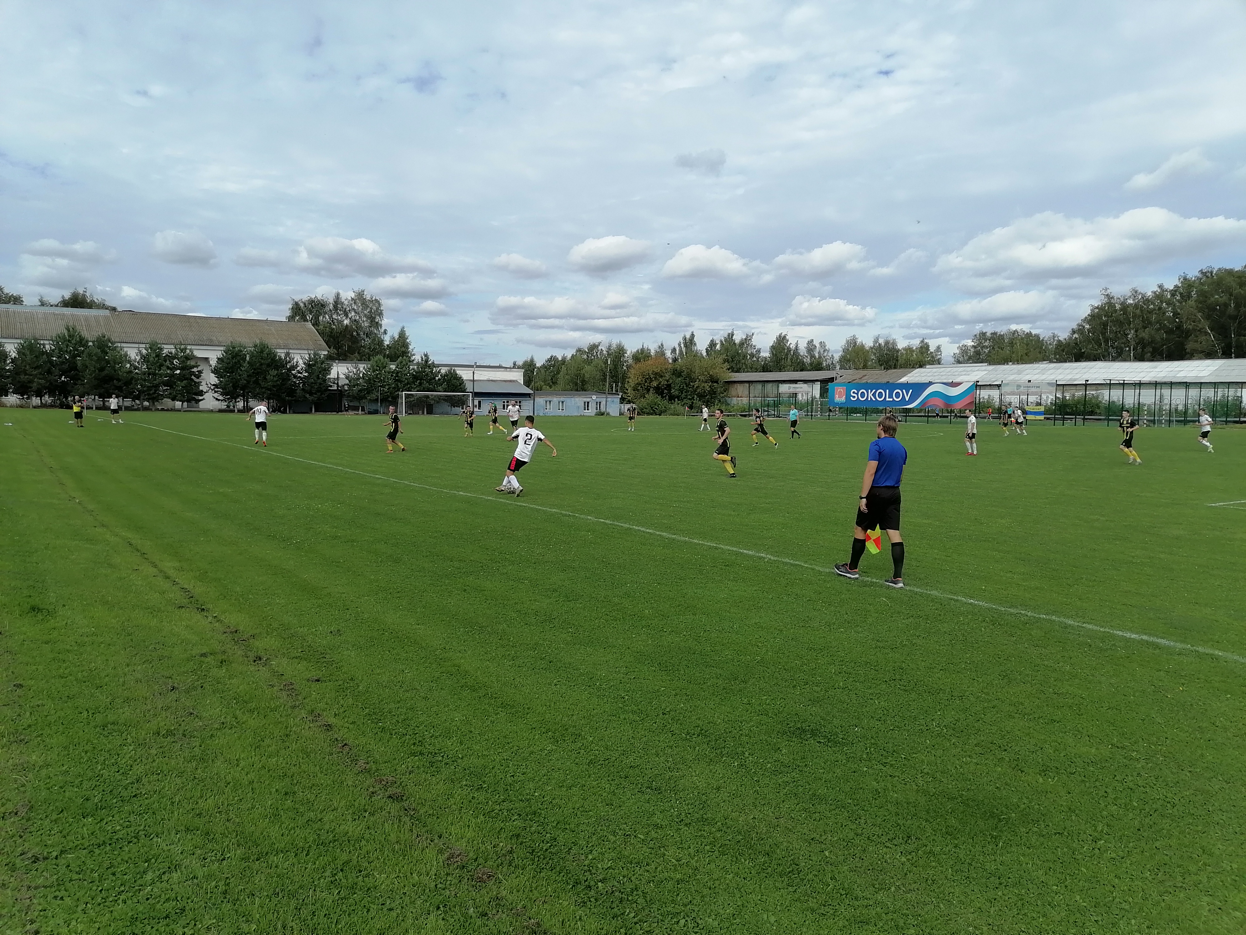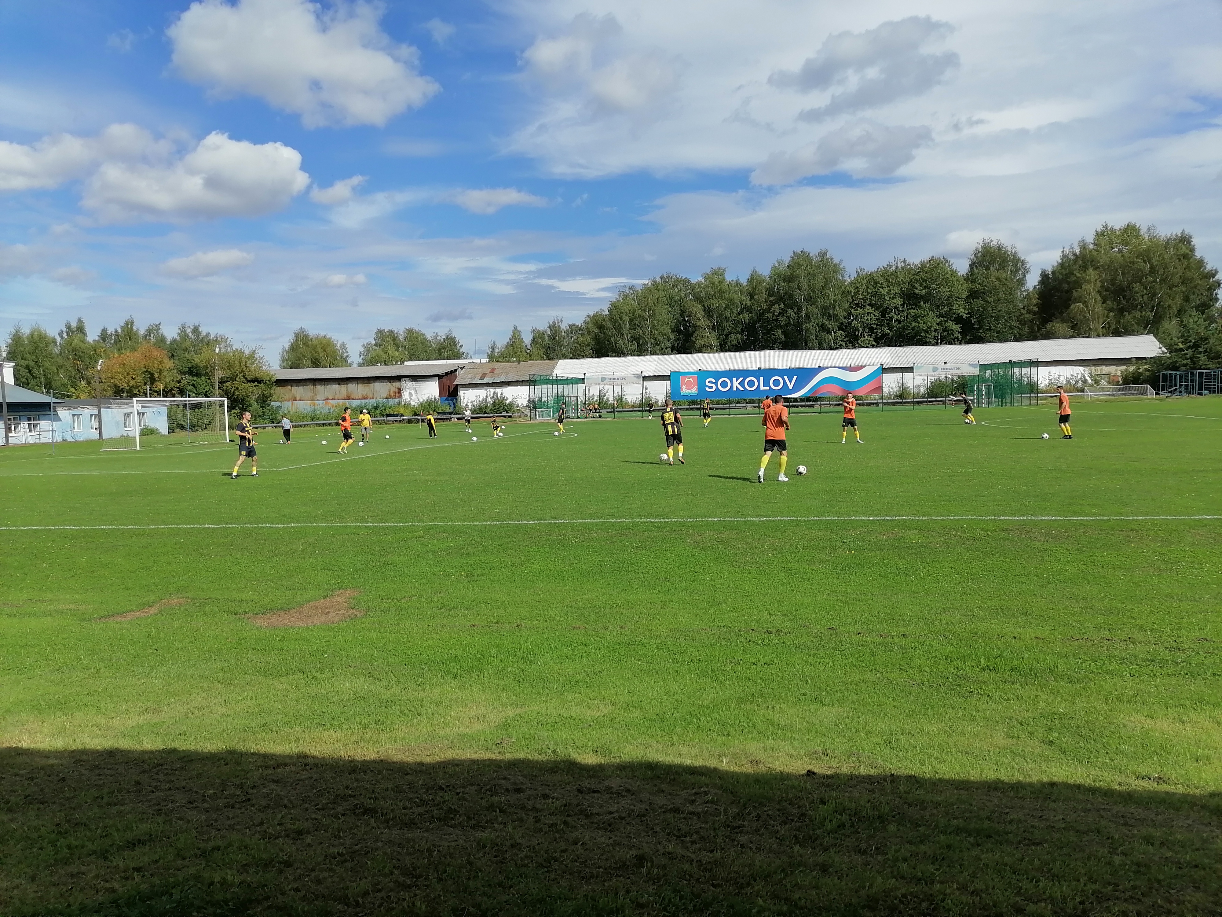 Приехал заранее, застал разминку перед игрой. Судя по баннеру, спонсирует футбол в поселке именно – эта ювелирная компания.