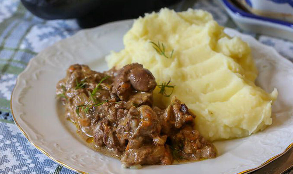 Приятным дополнением к картофельному пюре станет тушенная куриная печень.