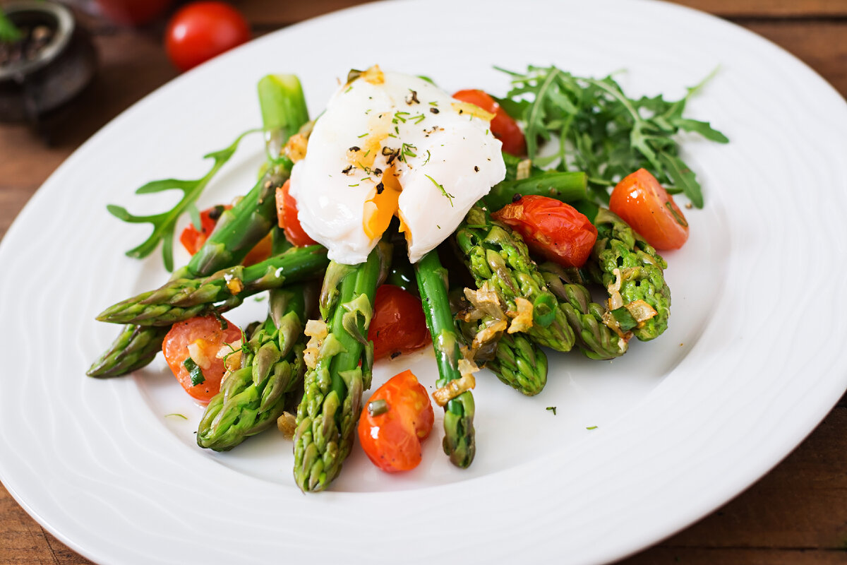 Салат со спаржей, перепелиными яйцами-пашот и копченой курицей