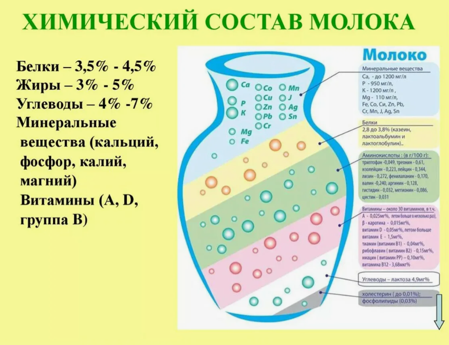В коровьем молоке большой набор питательных элементов, ниже представлены основные из них: