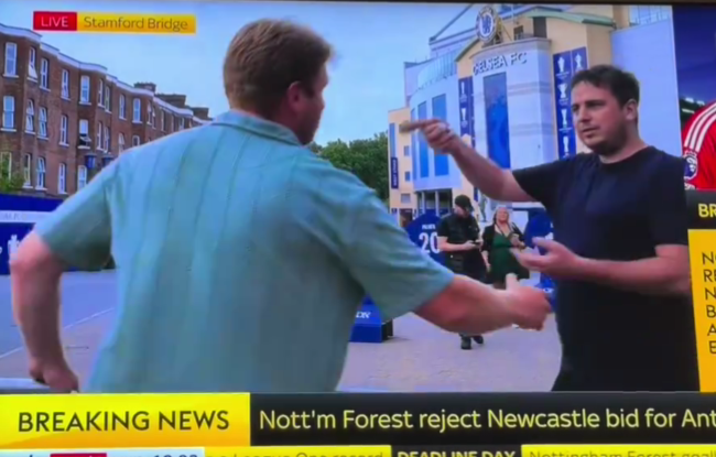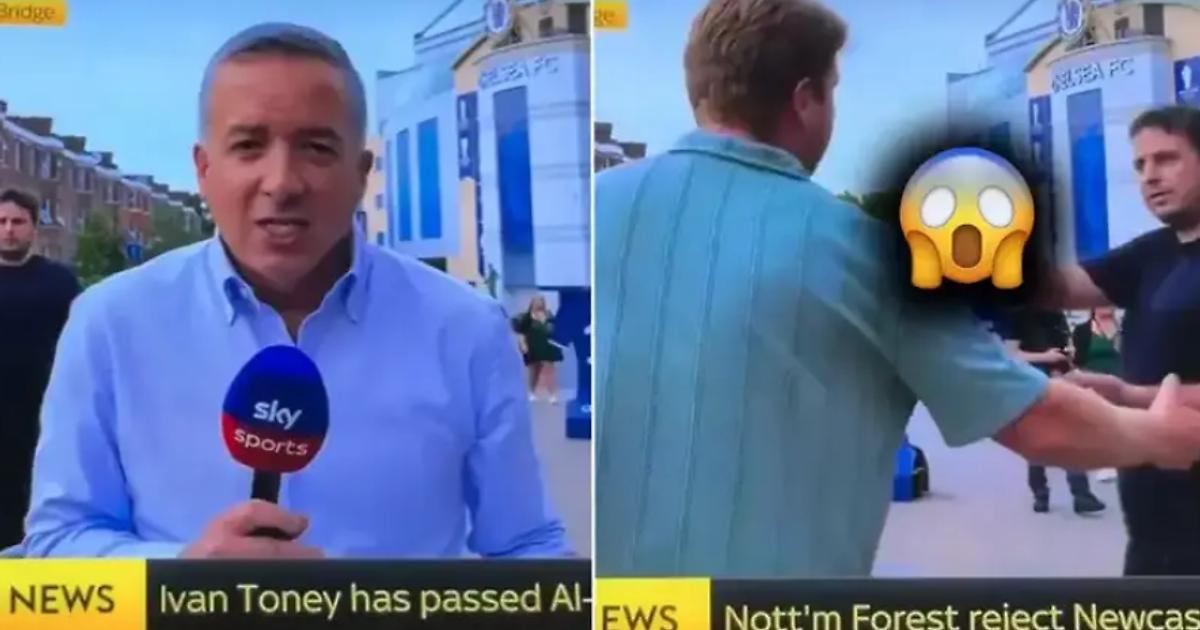 Инцидент произошел, когда репортер рассказывал новости о потенциальных трансферах «Челси» перед закрытием трансферного окна.