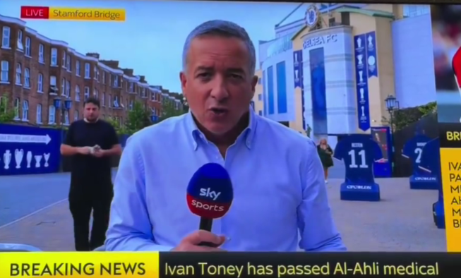 Репортер обсуждал возможный переход Джейдона Санчо из «Манчестер Юнайтед» в «Челси», когда позади него появился мужчина и начал размахивать секс-игрушкой перед лицом репортера.