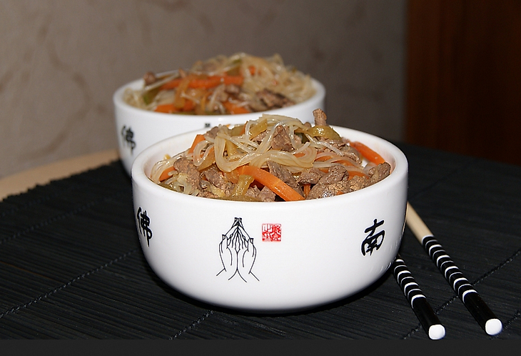В зависимости от диаметра лапши отвариваем ее или заливаем кипятком. Смотрите инструкцию на упаковке. После приготовления обдать фунчозу холодной водой. Лапшу добавляем к говядине с овощами, все тщательно перемешиваем. Снимаем с огня и оставляем под крышкой на 3-5 минут. Блюдо готово, можно сервировать и подавать к столу.