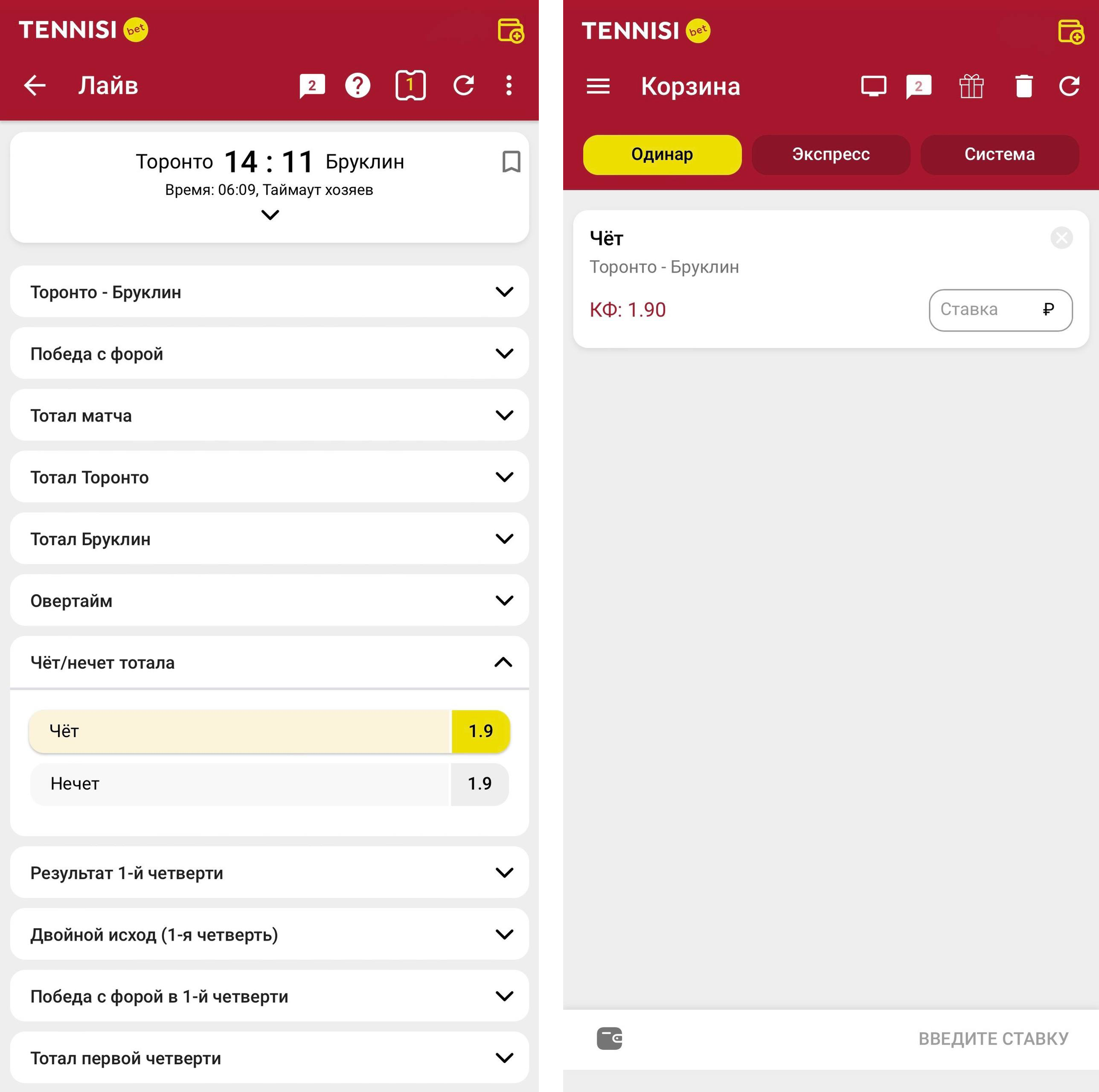 Пример: в матче между командами «А» и «Б» счет после третьей четверти 68:64. Вы предполагаете, что в четвертой четверти команды будут играть осторожно, и итоговый счет матча останется четным. Вы делаете ставку на «чет». Если итоговый счет окажется, например 82:78, ваша ставка выиграет.