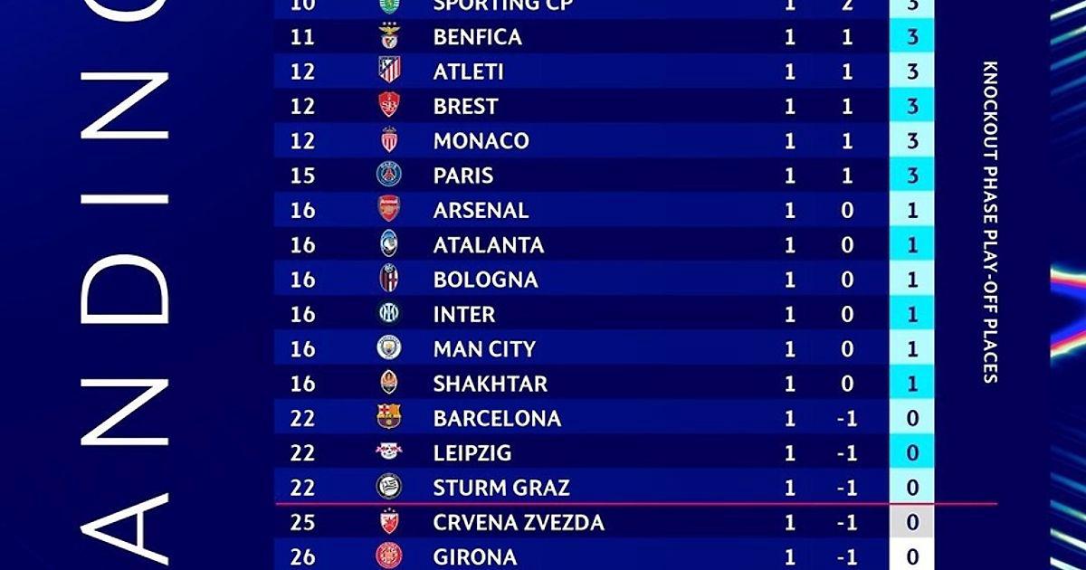Турнирная таблица Лиги Чемпионов после 1-го тура