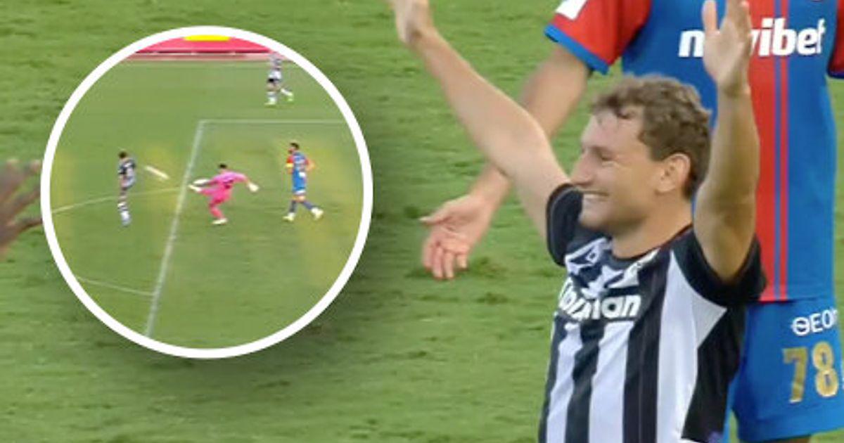 Взгляните только: наш форвард даже не бил, это вратарь «Волоса» бил в него, попал в ногу Феде – и мяч залетел в ворота.