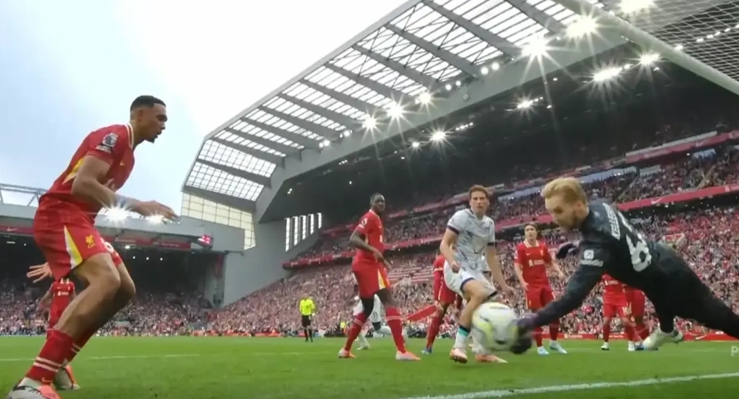 После того, как мяч попал в перекладину, он рикошетом отлетел прямо в Трента, а затем в ворота «Ливерпуля». Келлехер мгновенно показал лучшую реакцию.