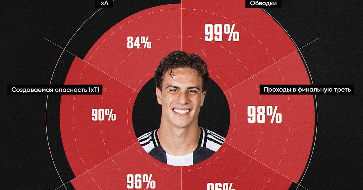 В 2022 году «Ювентус» забрал из академии «Баварии» суперталанта – Кенана Йылдыза. Уже через 2 года 19-летний игрок ворвался в основу итальянского гранда и получил «десятый» номер от своего кумира Алессандро дель Пьеро. ➕ Чем крут сейчас? У Йылдыза уникальная техника дриблинга: он – амбидекстр, но любит вести мяч «неудобной» ногой как инвертированный вингер. Кенан начинал как атакующий полузащитник, так что участвует в комбинациях как дополнительный хавбек. Раньше его много ругали за недоработки в обороне, но в футболе Тиаго Мотты, где вингеры выполняют много черновой работы, Йылдыз стал пахать и без мяча (топ-5% по отборам в топ-лигах среди атакующих игроков). ➖ Чего не хватает для топ-уровня? Йылдыз пофиксил проблемы с обороной, так что сейчас турку не хватает только результативности: за 27 матчей прошлого сезона всего 2+0, в 5 играх этого чемпионата 0+2.