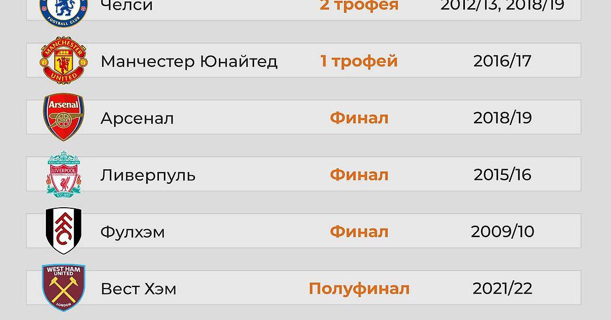 🏆 «Фулхэм» и «Вест Хэм» > «Ман Сити» и «Тоттенхэм». Как английские клубы выступают в ЛЕ? Сегодня стартует новая ЛЕ. Среди главных фаворитов –«Порту» (17,8% на победу по версии Opta), «Атлетик» (10,9%) и пражская «Славия» (9,6%), но есть шансы взять турнир и у английских «МЮ» (7,1%) и «Тоттенхэма» (8,6%). А чего команды АПЛ уже добились в ЛЕ? «Челси» выиграл оба турнира, в которых участвовал. В 2013-м в финале пала «Бенфика», а в 2019-м – «Арсенал». Для «канониров», к слову, тот розыгрыш ЛЕ стал самым успешным в истории. Жозе Моуринью принес «МЮ» трофей в 2017-м. Еще манкунианцы были близки к титулу в 2021-м, но в серии пенальти проиграли финал «Вильярреалу» Унаи Эмери. А вот соседи из голубой части Манчестера в ЛЕ не прижились. В последний раз «Ман Сити» заглядывал в турнир больше 10 лет назад и дальше 1/8 не проскакивал. Неожиданно крутые заходы показали «Фулхэм» и «Вест Хэм». Первые вообще героически пробрались до финала первого розыгрыша ЛЕ, где их остановил «Атлетико».