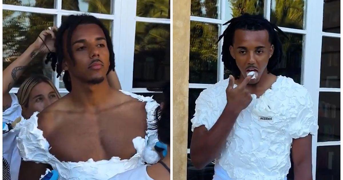 Для одного из нарядов Кунде оставили с голым торсом. Из аксессуаров — лишь бумажка с названием бренда. Игрока обмазали пеной для бритья, и вот как он выглядел