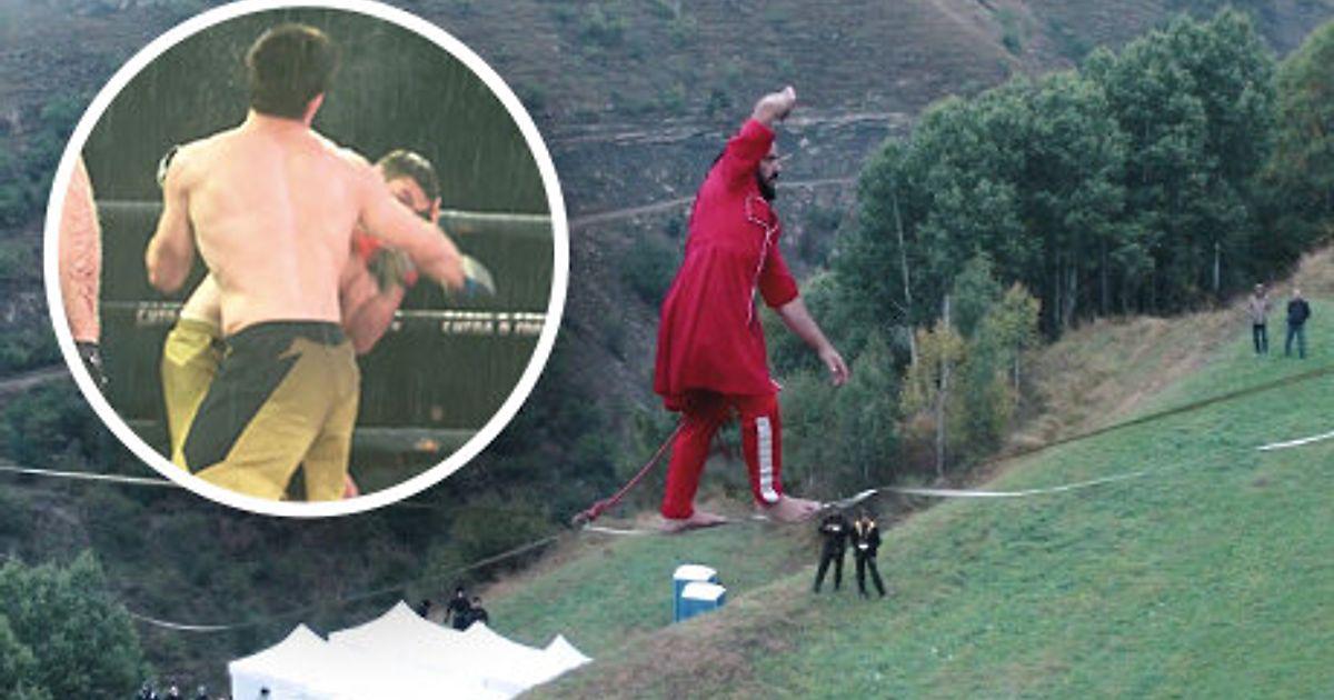 Село Согратль находится на высоте двух тысяч метров над уровнем моря – там установили ринг, сцену для выхода бойцов и несколько рядов для зрителей. Болельщиков развлекали национальными танцами и выступлением канатоходца Камиля Мамаева, уже проходившего по тросу на стадионе в Махачкале – все это на фоне гор.