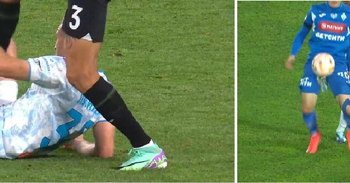 Где тут повод для пенальти - непонятно в принципе: до штрафной метра полтора. Теперь рассмотрим момент с точки зрения КК за «лишение явной возможности забить гол». Как минимум 1 защитник «синих» ближе к воротам, чем Роналдо, и этого в принципе достаточно, чтобы закончить спор - при невыполнении хотя бы одного из критериев, описанных выше (при удалении Гогуа) выносится предупреждение за «срыв перспективной атаки». Почему Карасев не показал ЖК? Посмотрите еще один момент - уже из второго тайма с фолом уже на игроке Динамо в этом же месте поля