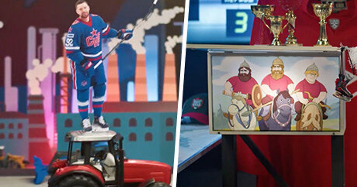 Кузнецов коньком запускает цепную реакцию: один за другим начинают падать как костяшки домино деревянные фигурки, около макета «СКА-Арены» – болельщики в синих шарфиках, а внутри него – хоккеисты. Одна из отсылок к прошлому сезону – число 21481 над миниатюрным стадионом: столько зрителей собрал первый матч на «СКА-Арене».