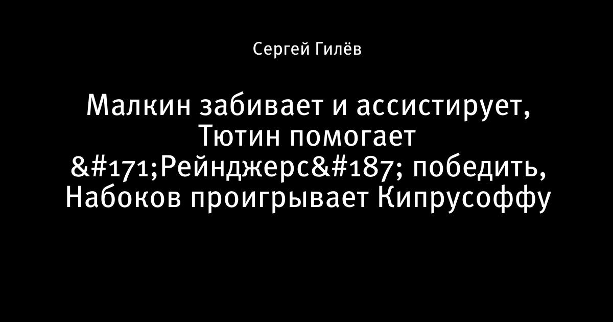10 апреля 2008, 09:37 Малкин забивает и ассистирует, Тютин помогает «Рейнджерс» победить, Набоков проигрывает Кипрусоффу Россияне в Кубке Стэнли 2008.Малкин: Тютин: Набоков: Автор Сергей Гилёв Этот пост опубликован в блоге на Трибуне Sports.ru. Присоединяйтесь к крупнейшему сообществу спортивных болельщиков! Другие посты блога Айс-ТВ